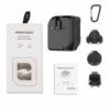 The product in the image is a Mini Studio Portable Bluetooth Speaker with Power Bank, also described as a travel adapter power bank. It features a 3000mAh or 6000mAh power bank and speaker. The product includes interchangeable plug adapters for use in different countries and a carabiner for portability.