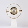 encased in a gold-tone circular frame, and mounted on a white trapezoidal base.
