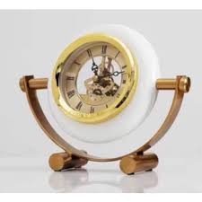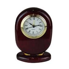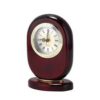 The clock is a wooden desk clock with a round, maroon-colored case and base.