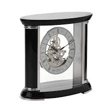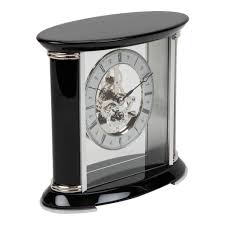 It features a black piano finish wooden case with a silver skeleton dial, allowing the inner workings to be seen.